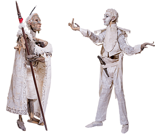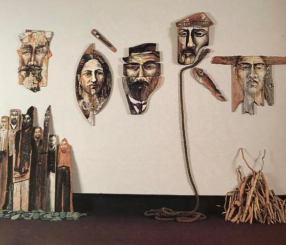 The key figures are sculpted from found wood, tapa cloth and paint.